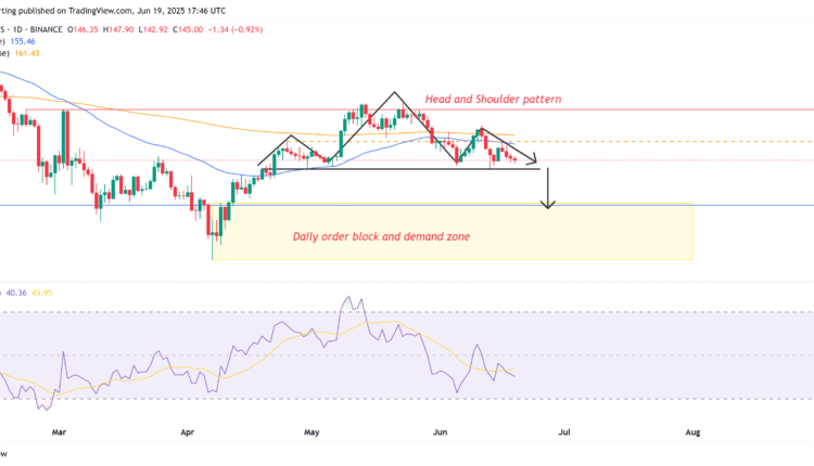 On the 1-day time frame, SOL shows a head-and-shoulders pattern, which is a bearish reversal signal. A breakdown below its $140 neckline level, confirmed by a volume spike, could lead to a bearish continuation.