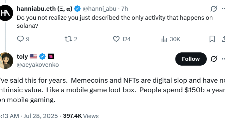 “I’ve said this for years. Memecoins and NFTs are digital slop and have no intrinsic value,” Yakovenko said in a X post on Sunday while comparing the crypto tokens to loot boxes in free-to-play mobile games.