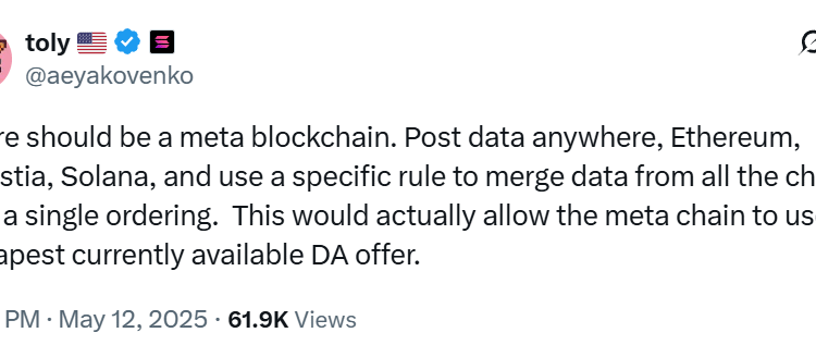 In a May 12 post on X, Yakovenko proposed a “meta blockchain,” that could aggregate and order data posted across multiple layer-1 chains, including Ethereum, Celestia and Solana.