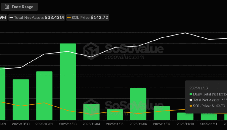 Spot Solana (SOL) exchange-traded funds continued to attract investor interest, recording their thirteenth straight day of inflows, underscoring institutional demand for the network’s native asset.
