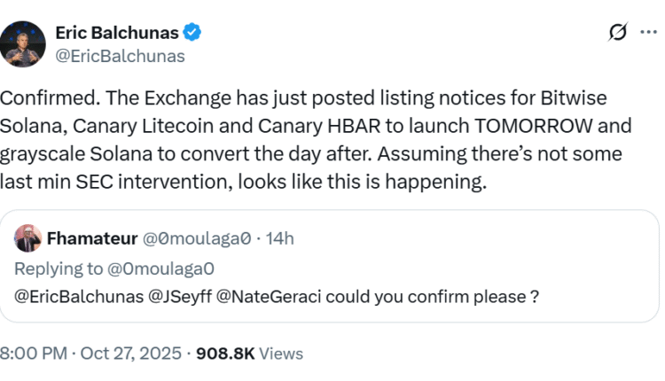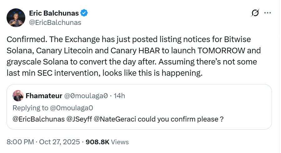 At least three altcoin ETFs are expected to launch later on Tuesday: Bitwise’s Solana (SOL) ETF, Canary’s Litecoin (LTC) and Hedera (HBAR) ETFs, according to Bloomberg analyst Eric Balchunas.
