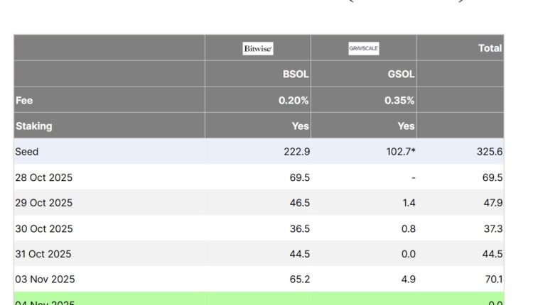 Data from Bitwise indicated that two Solana ETFs, Bitwise’s BSOL US Equity and Grayscale’s GSOL US Equity, collectively attracted $199.2 million in net inflows (excluding seed capital) during their first week.