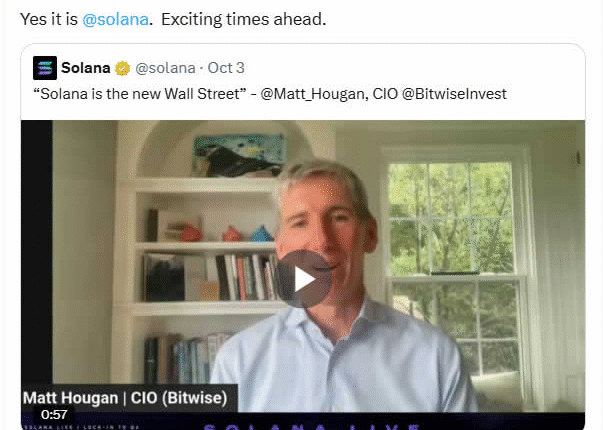 “I think Solana is the new Wall Street,” said Hougan, speaking with Solana Labs’ Akshay Rajan on Oct. 2. He added that the Wall Street audiences consider Bitcoin (BTC) “very ephemeral” and “hard to get their heads around.”