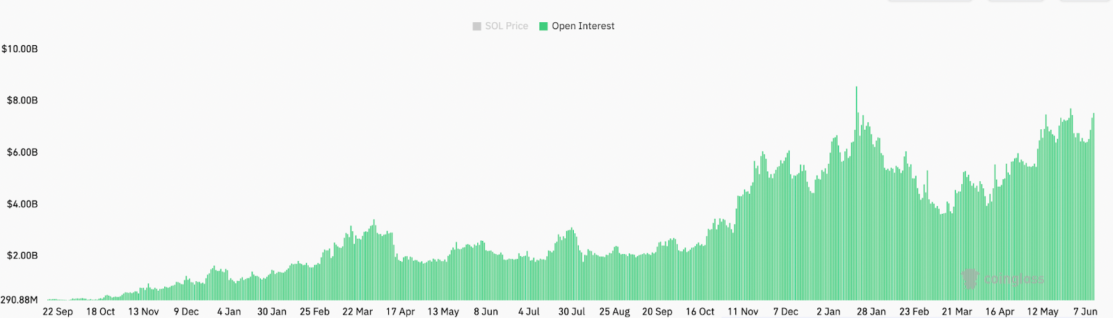 SOL’s price growth on June 11 was accompanied by an uptick in leveraged positions, with the aggregate open interest (OI) for Solana futures reaching $7.54 billion, up 12% in the last 24 hours. This is a 20% increase from the previous week and sits just 12% below the peak of $8.57 billion reached on Jan. 19.