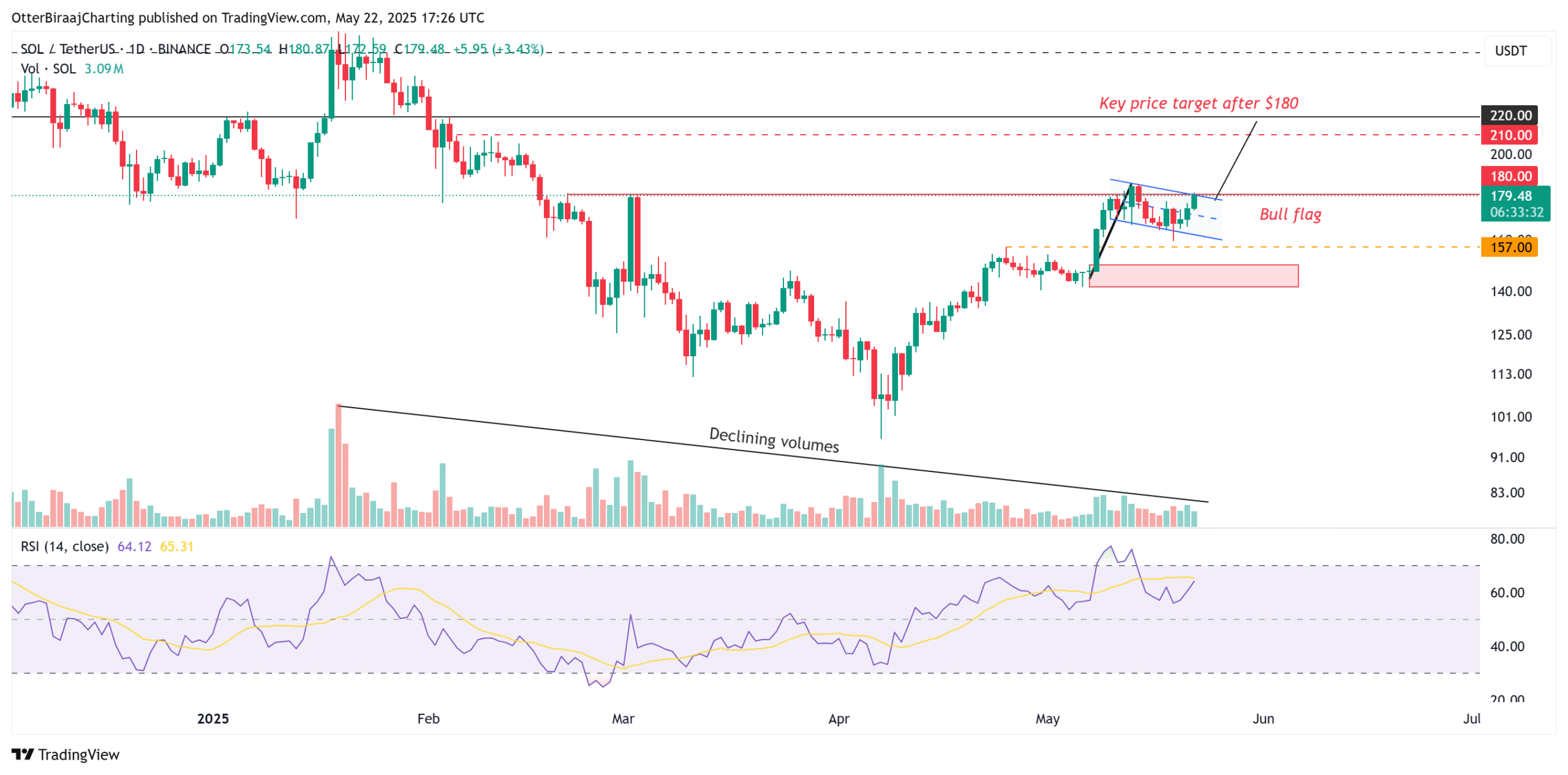 If SOL fails to breach $180, the immediate key area of interest is between $140-150, and the bull flag pattern would be invalidated. The support range is a daily order block, which should provide higher time frame (HTF) support in case of a price correction.