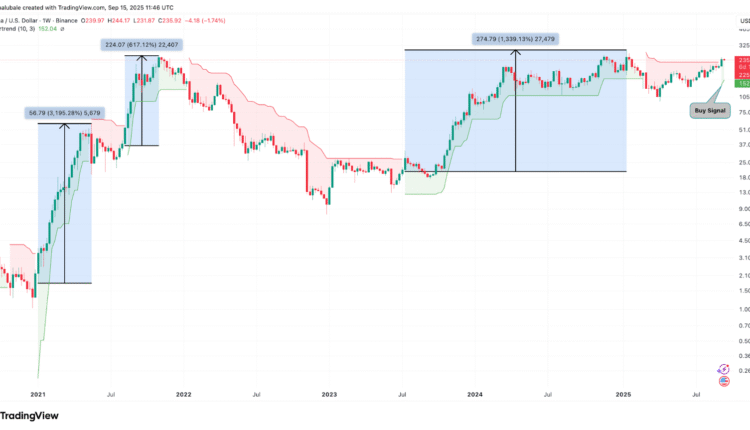 Solana’s (SOL) SuperTrend indicator has sent a “buy” signal on its weekly chart, an occurrence that has historically preceded parabolic rallies.