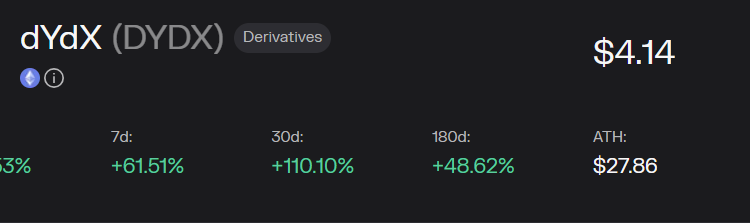 The platform behind the DYDX token is dYdX, which is a decentralized exchange (DEX) that offers futures contracts on EVM blockchains like Ether (ETH). On Oct. 27, dYdX launched its layer-1 blockchain with the creation of its genesis block, which operates using native DYDX tokens. The launch allowed for the on-chain distribution of all fees received to validators and stakers. The protocol update has been fantastic for the DYDX token price, sending it up over 110% in the past 30-days.