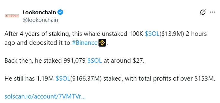 On April 22, the whale started offloading a portion of the token stash to cash out on the gains. Lookonchain reported that the whale had unstaked 100,000 SOL tokens (about $14 million) and sent them to Binance. Sending tokens to crypto exchanges often indicates an intent to sell.