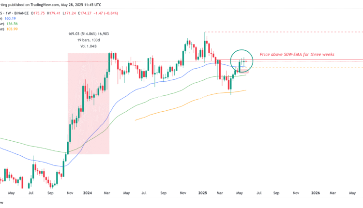 Solana (SOL) price tested the $180 resistance level on May 11, but it has since consolidated below this key threshold and appears unable to establish a sustained bullish position. However, the altcoin has maintained a positive signal by closing above the 50-week exponential moving average (EMA) for three consecutive weeks. This critical level has historically acted as a catalyst for significant price rallies.