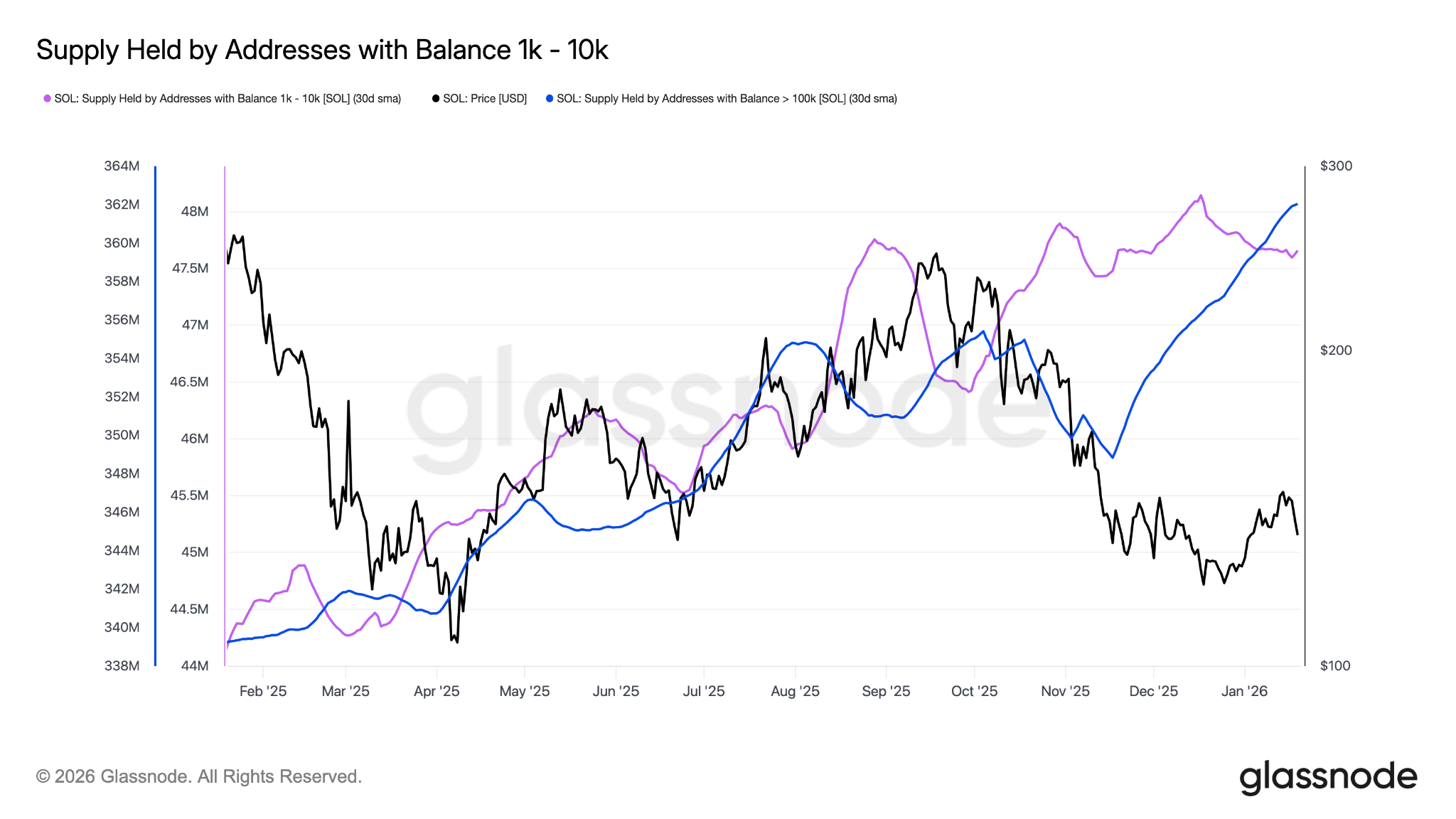 Data from Glassnode reveals that whale addresses holding between 1,000 and 10,000 tokens have increased sharply since late November 2025, as shown in the chart below. These entities now hold approximately 48 million SOL, about 9% of the total circulating supply.