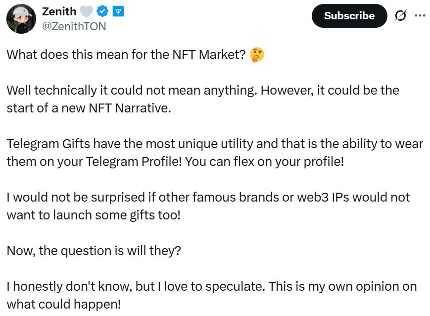 “Telegram Gifts have the most unique utility and that is the ability to wear them on your Telegram Profile,” Zenith said.