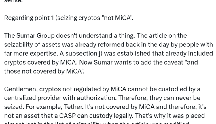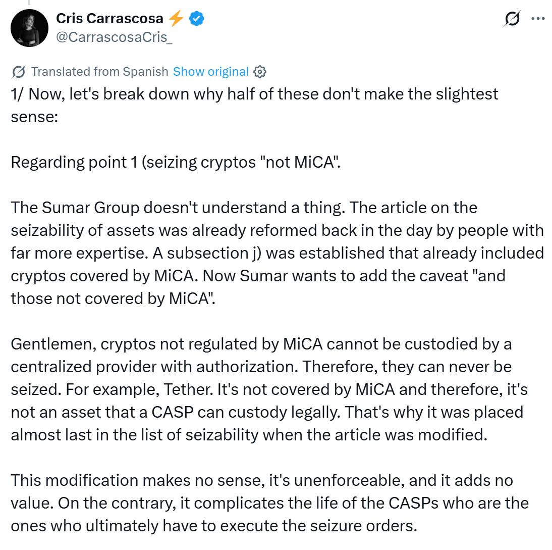 Another controversial element is the proposal to classify all cryptocurrencies as attachable assets eligible for seizure. Lawyer Cris Carrascosa said on X that this is unenforceable, especially for tokens like Tether’s USDt (USDT), which cannot be held by regulated custodians under MiCA rules.
