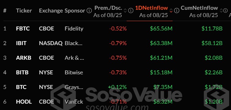 BlackRock’s iShares Bitcoin Trust (IBIT) followed closely with $63.38 million, while ARK Invest’s ARK 21Shares Bitcoin ETF (ARKB) added $61.21 million.