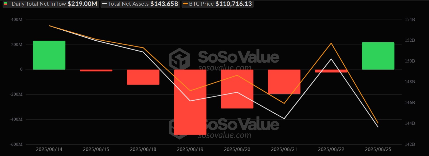 Spot Bitcoin exchange-traded funds (ETFs) ended a six-day streak of net outflows on Monday, with $219 million in daily inflows.
