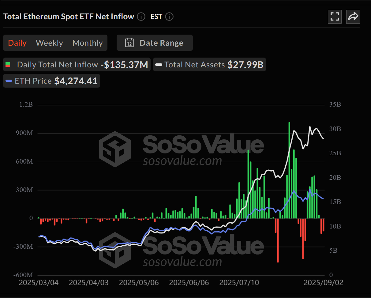 The reversal came after a strong August for Ethereum funds, which saw $3.87 billion in inflows compared with Bitcoin (BTC) ETFs’ $751 million outflows.