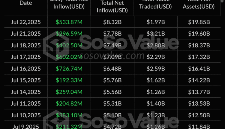 Spot Ether exchange-traded funds (ETFs) continued their bullish momentum on Tuesday, recording a net inflow of $533.87 million and extending their streak to 13 consecutive trading days of inflows, according to data from SoSoValue.