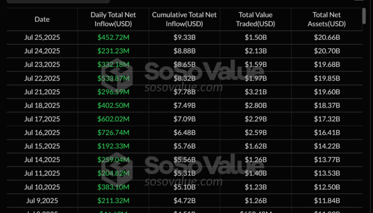 The 16-day run has seen consistent daily contributions, peaking with $726.74 million in inflows on July 16 and maintaining momentum with multiple $300M+ sessions. Since July 2, when the streak began, net inflows have more than doubled from $4.25 billion to the current $9.33 billion.