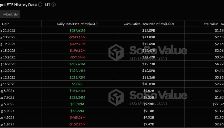 The rebound follows a period of sustained outflows, with funds shedding over $924 million between last Friday and Thursday. The largest withdrawal came on Tuesday, when spot Ether (ETH) ETFs saw $429 million exit — the second-largest daily net outflow seen this month, following the $465 million that left the market on Aug. 4.