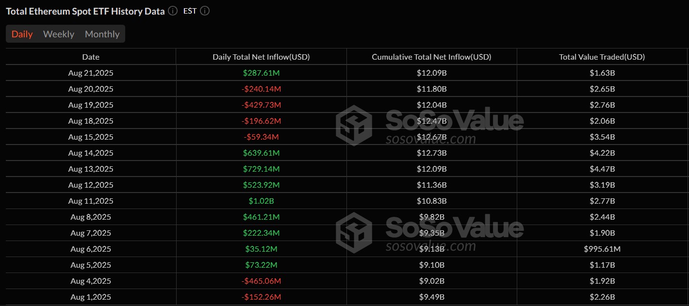 United States’ spot Ether exchange-traded funds (ETFs) funds drew $287.6 million in net inflows on Thursday, snapping a four-day streak of outflows, according to data from crypto ETF tracker SoSoValue.