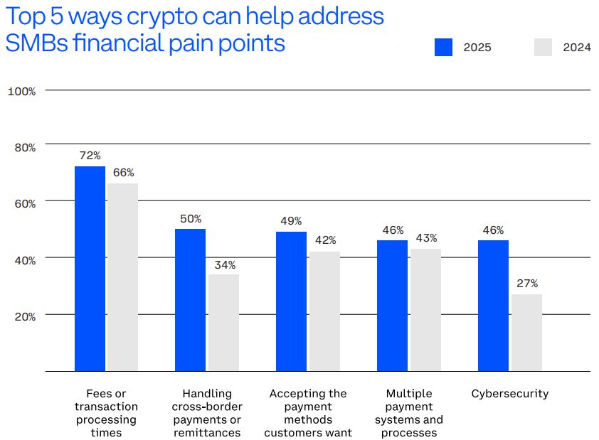 More than 82% of SMBs also said they think crypto can help address at least one financial issue with their business, such as transaction fees and cross-border payments.