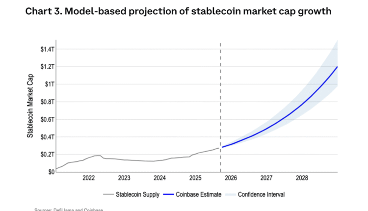 The total US dollar-pegged stablecoin market is projected to swell to $1.2 trillion by 2028, spurred on by comprehensive crypto regulations in the United States, according to crypto exchange Coinbase.