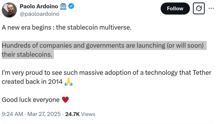 In a March 27 X thread, Ardoino said the crypto industry just entered the “stablecoin multiverse” era, where multiple stablecoins are launching to meet growing global demand.