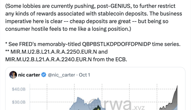 The average interest rate for US savings accounts is 0.40%, and in the EU, the average rate on savings accounts is 0.25%, Collison said in response to VC Nic Carter’s X post outlining the rise of yield-bearing stablecoins and the future of the sector. Collison added: