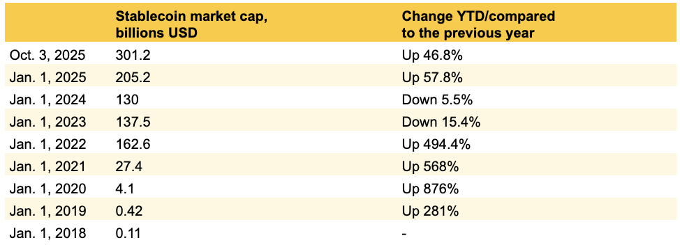To match last year’s 58% growth, stablecoins would need to add another $23 billion in value by year-end. With $40 billion added in the third quarter alone, analysts say the market is on track.