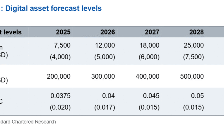 Standard Chartered anticipates ETH will surpass its previous all-time high of $4,866 by the end of Q3 2025, continuing its recent outperformance against Bitcoin. It projects the ETH-BTC ratio will climb from 0.036 to 0.05 as Ethereum’s fundamentals strengthen.