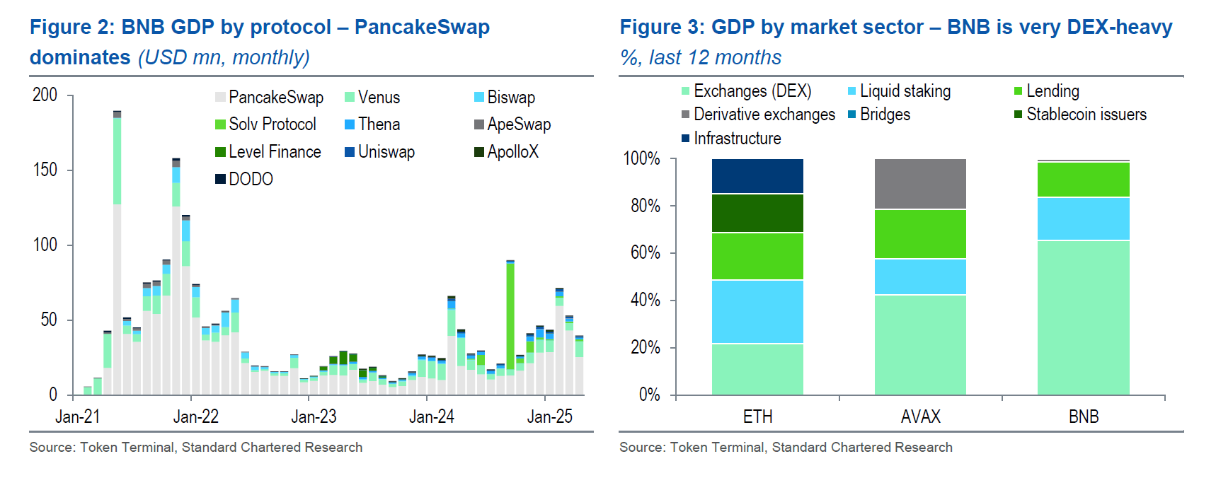 The BNB Chain has less developer activity than L1s such as Ethereum or Avalanche and its ecosystem is comparatively “old-fashioned”,” Standard Charter said.