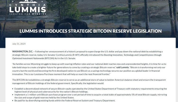 Her bill, dubbed the BITCOIN Act, calls for the US Treasury Department to gradually accumulate 1 million BTC, ultimately acquiring “a total stake of approximately 5% of total Bitcoin supply, mirroring the size and scope of gold reserves held by the United States,” according to Lummis’ website.