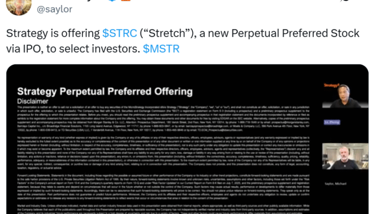 Michael Saylor’s Strategy announced plans to conduct an initial public offering of 5 million shares of Strategy’s Variable Rate Series A Perpetual Stretch Preferred Stock (STRC).