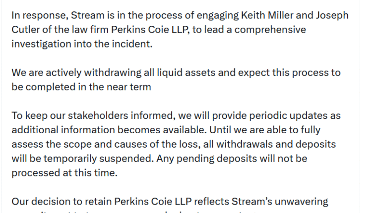 While Stream Finance investigates the problem, the platform has temporarily suspended withdrawals and will not process any pending deposits.