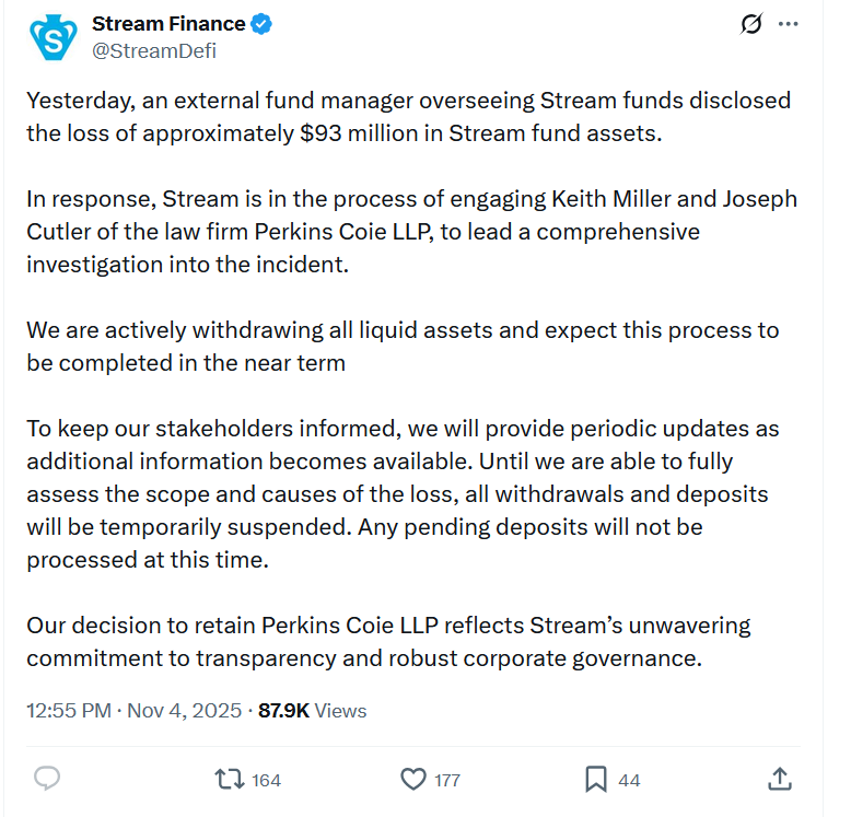 Decentralized finance platform Stream Finance says it has paused deposits and withdrawals after an external fund manager overseeing its funds found a $93 million loss in its assets.
