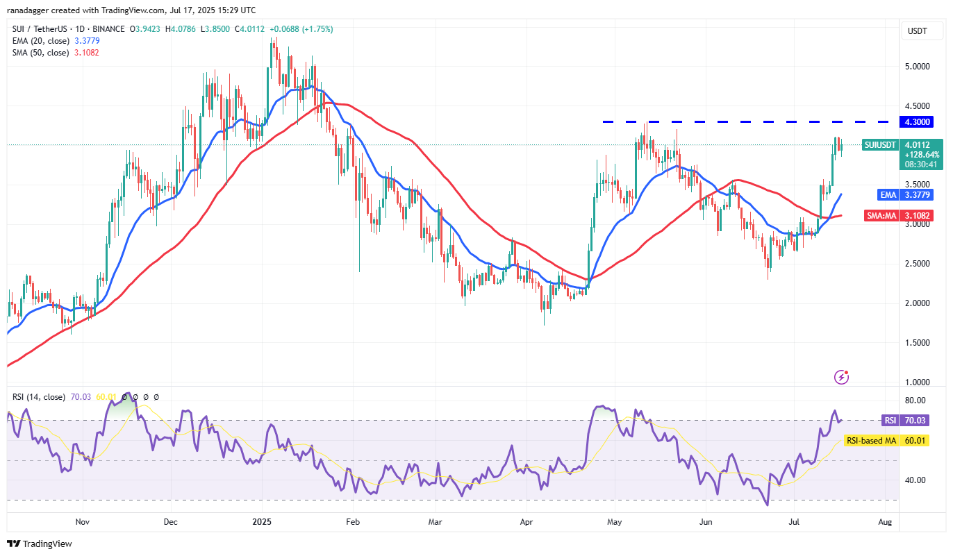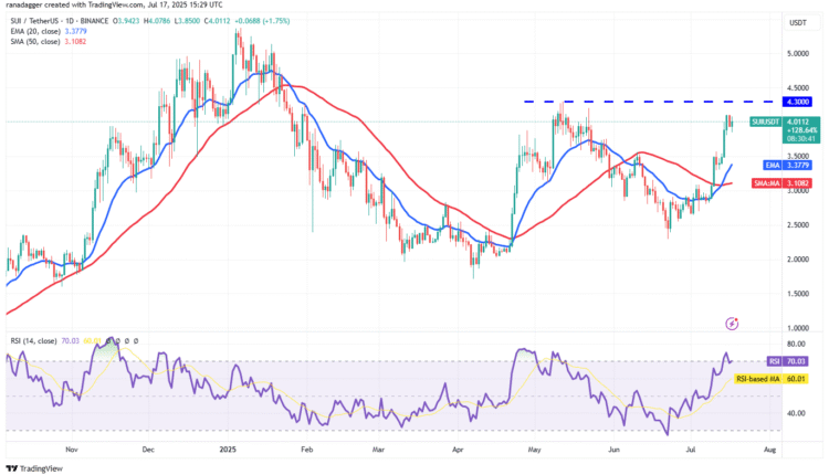 The up move has reached near the overhead resistance of $4.30, where the sellers are expected to mount a strong defense. There is support at $3.81 and then at the 20-day exponential moving average ($3.37). If the price rebounds off the 20-day EMA, the bulls will again attempt to drive the SUI/USDT pair above $4.30. If they manage to do that, the pair could surge to $5 and eventually to $5.37.