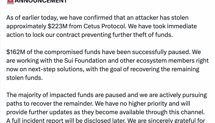 Cetus, a decentralized crypto exchange (DEX) built atop the Sui blockchain network, said $162 million of over $220 million stolen in a May 22 hack has been frozen.