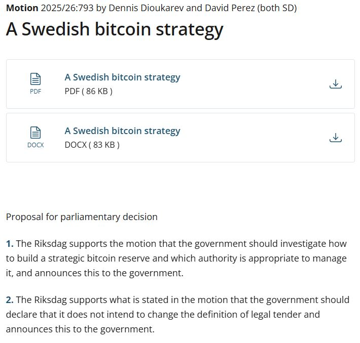 Two members of Sweden’s parliament, the Riksdag, have proposed that the country investigate establishing a strategic Bitcoin reserve to tackle inflation and diversify its holdings.