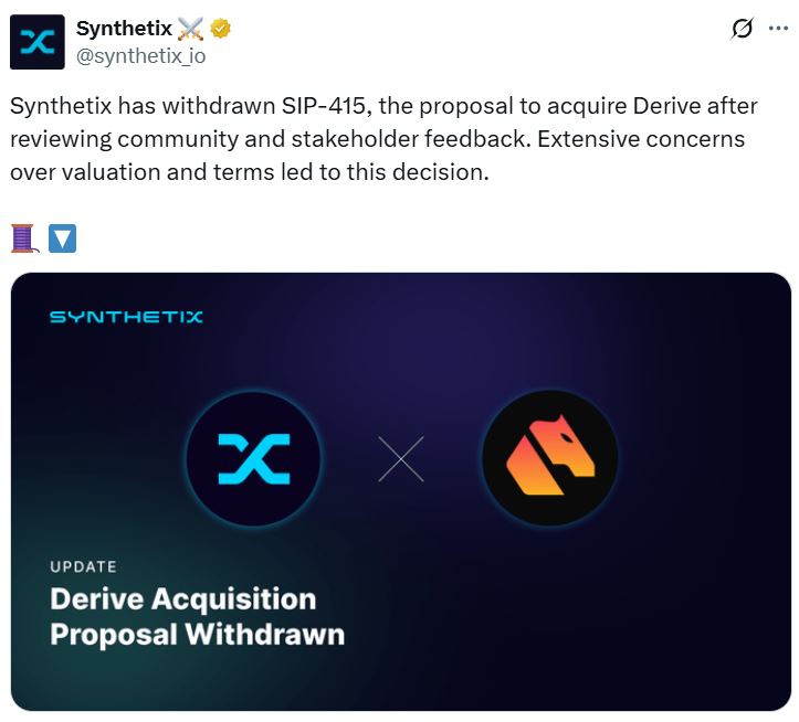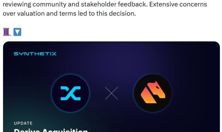 Decentralized finance platform Synthetix has axed its $27 million plan to acquire crypto options platform Derive after negative community feedback.