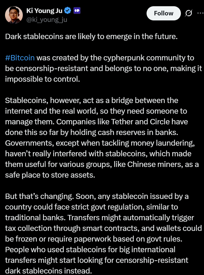 “People who used stablecoins for big international transfers might start looking for censorship-resistant dark stablecoins instead,” said CryptoQuant CEO Ki Young Ju.