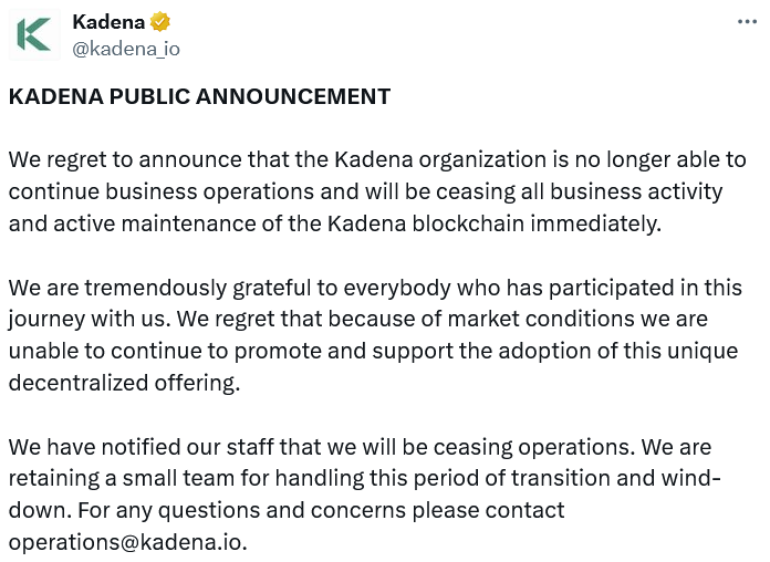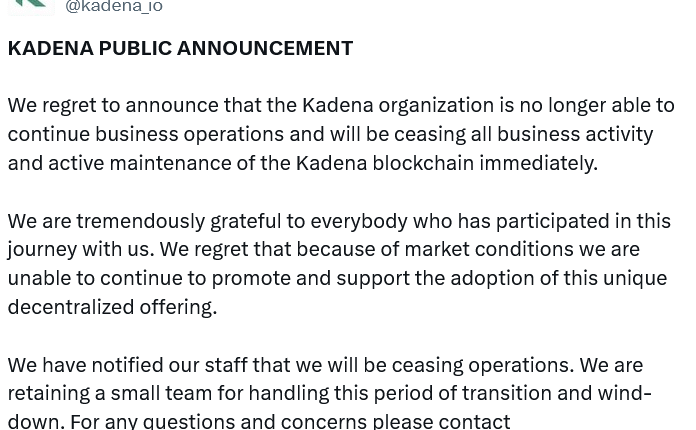 In a post to X on Tuesday, Kadena said it “is no longer able to continue business operations and will be ceasing all business activity and active maintenance of the Kadena blockchain immediately.”