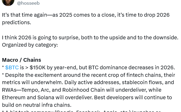 When it comes to price forecasts, the Dragonfly executive expects Bitcoin to trade above $150,000 by the end of 2026, but tips that Bitcoin dominance will fall.