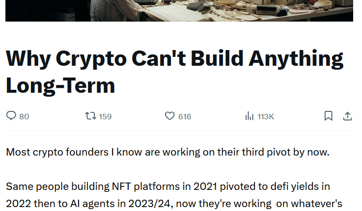In a Saturday article posted on X titled “Why Crypto Can’t Build Anything Long-Term,” Sargsiai suggested many crypto founders have paper hands, switching gears at the first sight of trouble.