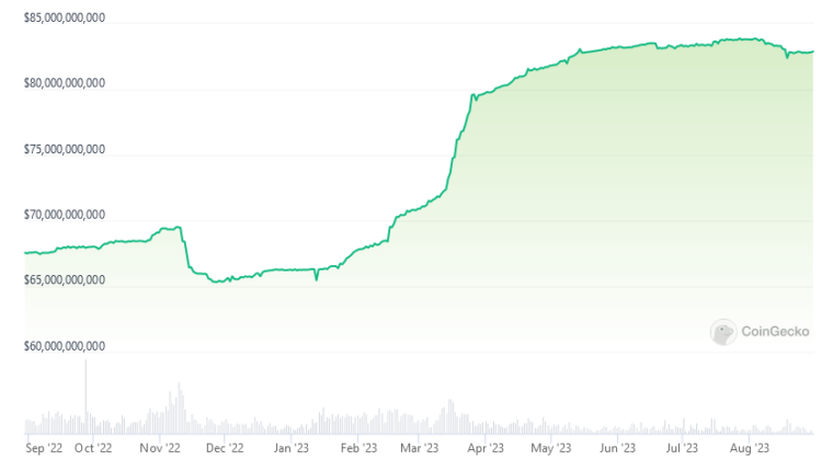 USDT’s market cap rallied over 20% to $80 billion over the first four months of 2023 — amid the banking crisis involving Silvergate Bank, Signature Bank and Silicon Valley Bank — but has since steadied out around the $80-82 billion since then.