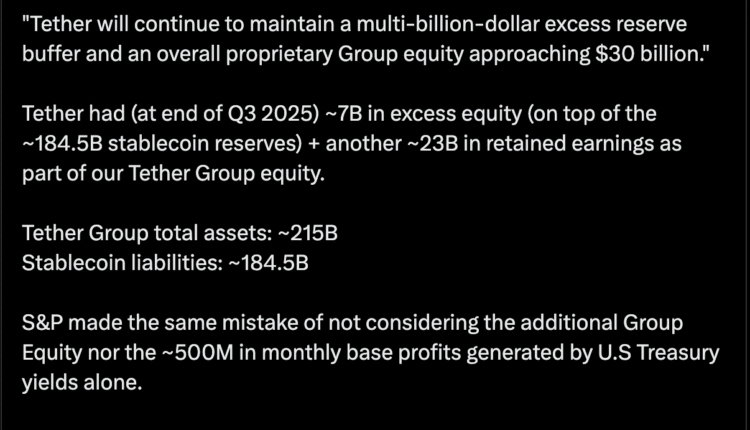 “Tether had, at the end of Q3 2025, about $7 billion in excess equity, on top of the about $184.5 billion in stablecoin reserves, plus about another $23 billion in retained earnings as part of our Tether Group equity.