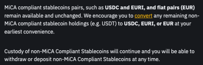 Despite removing the affected tokens for trading, Binance said it will support deposits and withdrawals of non-MiCA-compliant stablecoins after the delisting on March 31.