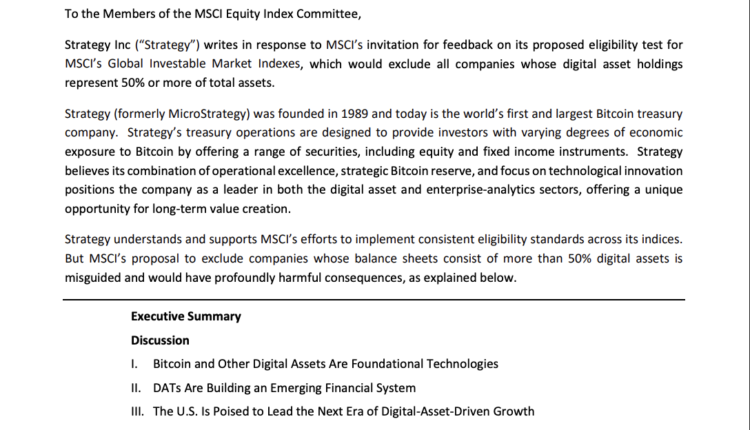 Strategy, the largest Bitcoin treasury company, submitted feedback to index company MSCI on Wednesday about the proposed policy change that would exclude digital asset treasury companies holding 50% or more in crypto on their balance sheets from stock market index inclusion.