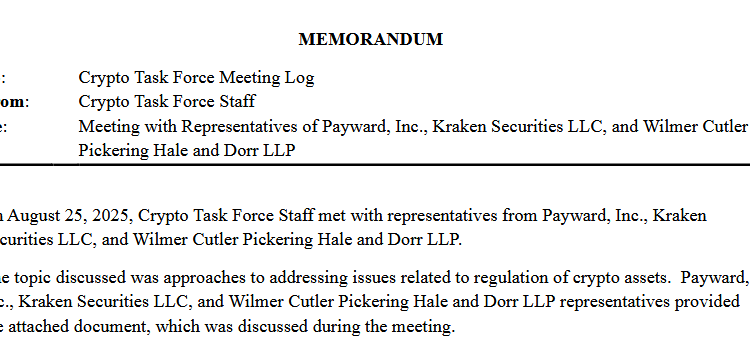 A memorandum filed on Monday noted that SEC staff met with four representatives of Payward, Inc., Kraken Securities LLC, and two from the law firm Wilmer Cutler Pickering Hales and Dorr LLP.