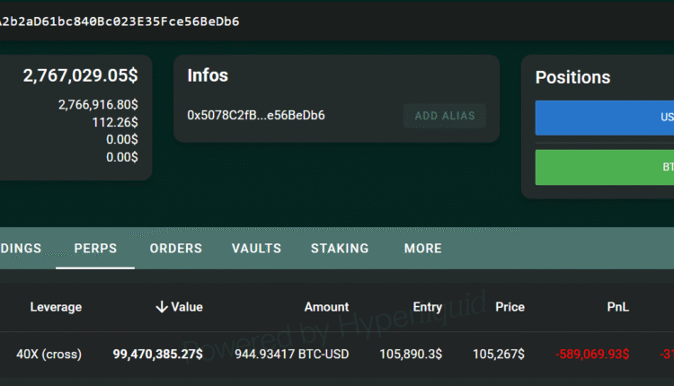 According to blockchain data aggregator Hypurrscan, the position is set to be liquidated if Bitcoin (BTC) falls below $103,630 and is currently showing an unrealized loss of over $592,000.
