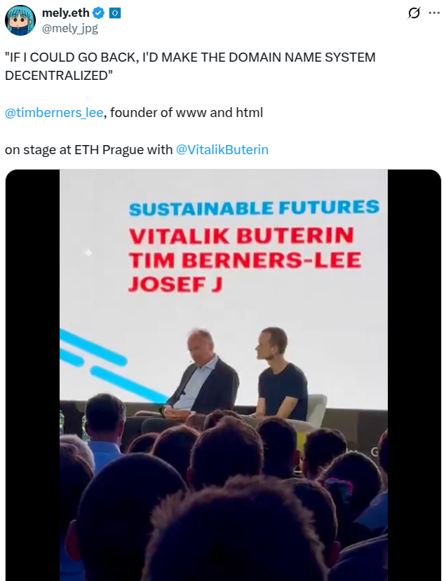 Speaking at ETH Prague on stage alongside Ethereum co-founder Vitalik Buterin, Berners-Lee reflected on early internet architecture decisions.