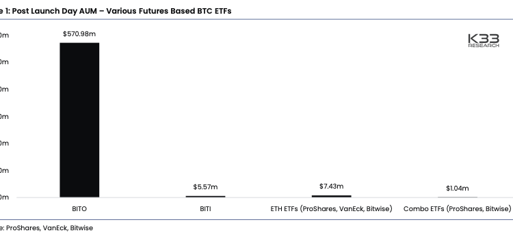 Day one trading of ETH futures ETFs accounted for just 0.2% of what BTC futures ETFs amassed in 2021. Source: K33 Research